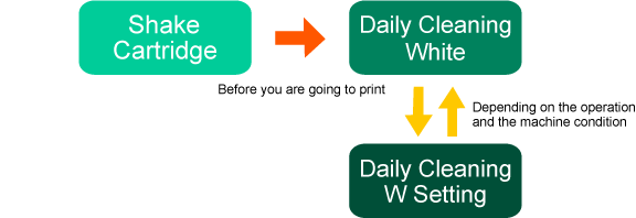 You do not have to "Daily Cleaning White" every morning, but do it every time on your working days. But what about the case when you print many, many T-shirts late at night and go on working early in the next morning? Well, we would like to say "shake the cartridges and print "Nozzle Check Pattern", and "Whiteness" (see Check it!) if you feel the print is white enough", of course the whiteness depends on the condition of the garment and the pretreatment tube cleaning, etc. so please check the whiteness as well as Nozzles.